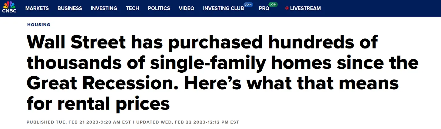 CNBC stellte fest, dass „die Einfamilienhausvermietungsbranche mit staatlicher Unterstützung in der Folge der Finanzkrise von 2008 ihren Anfang nahm“ – die wiederum von der Wall Street verursacht wurde.