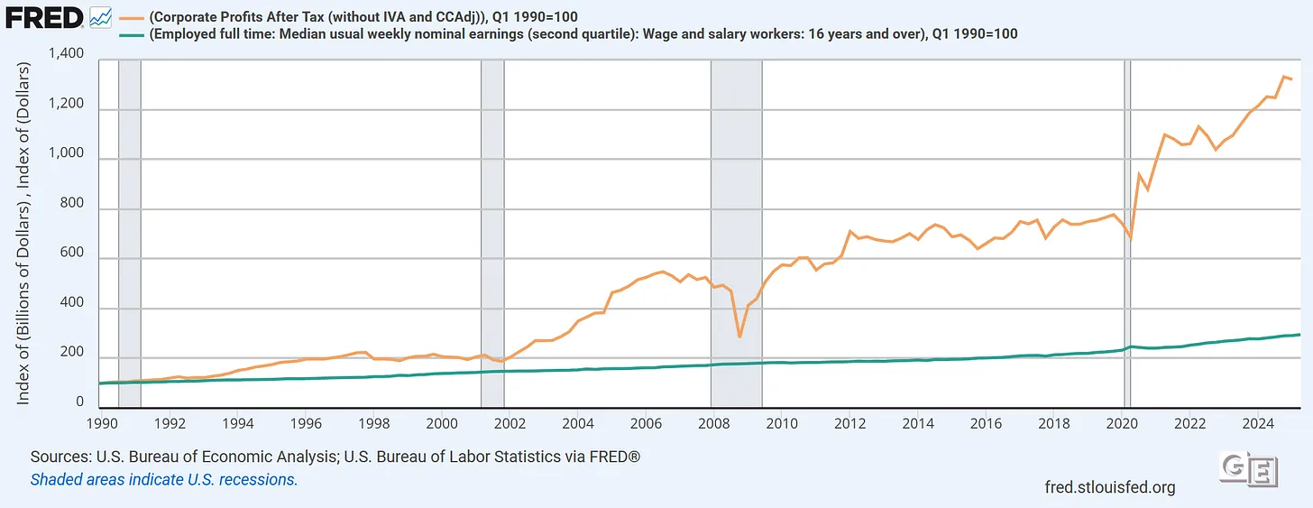 Die Gewinnmargen sinken in China praktisch auf null, während in den USA die Unternehmensgewinne auf einem Allzeithoch sind – und der Anteil der Arbeit am Einkommen sinkt und sinkt, während die Unternehmensgewinne auf einem Allzeithoch sind.