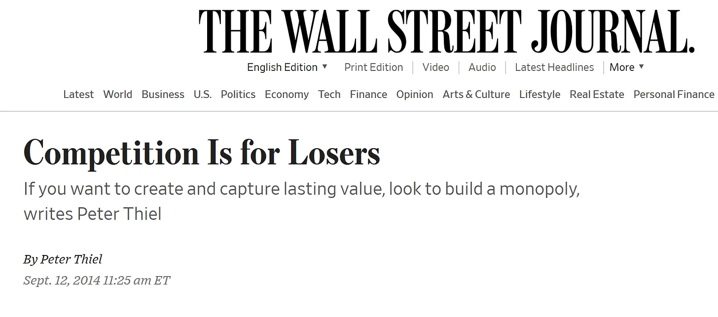 Peter Thiel verteidigt seit Jahren Monopole. Er veröffentlichte einen Kommentar im Wall Street Journal mit dem Titel „Competition Is for Losers” (Wettbewerb ist etwas für Verlierer), in dem er beklagte, dass bei starkem Wettbewerb die Gewinnmargen auf null sinken. Er sagte, dass deshalb alle Kapitalisten ein Monopol wollen, und argumentierte, dass dies eine gute Sache sei.