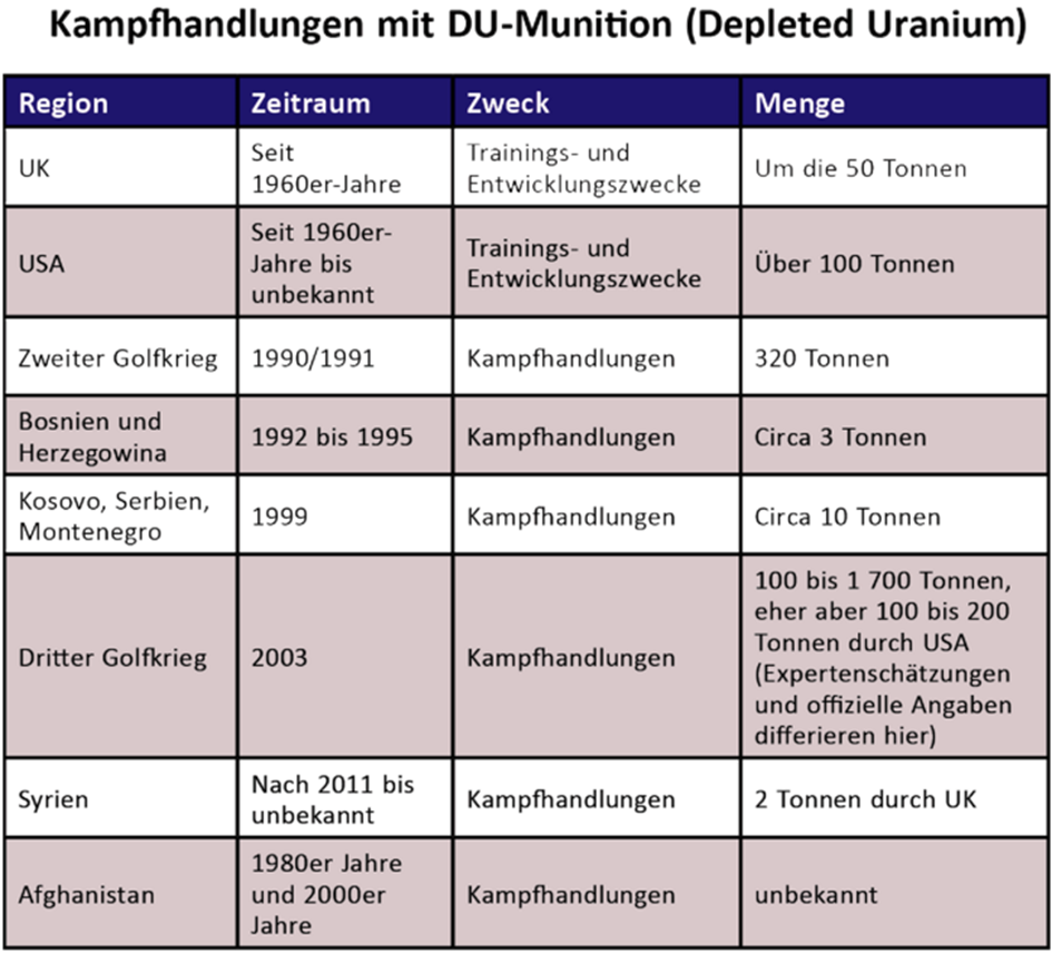Einen guten, wenn auch von den USA und GB nicht abschließend bestätigten, Überblick über den Einsatz von DU Munition findet man in der österreichischen Zeitschrift „Truppendienst“ vom 26. April 2022: