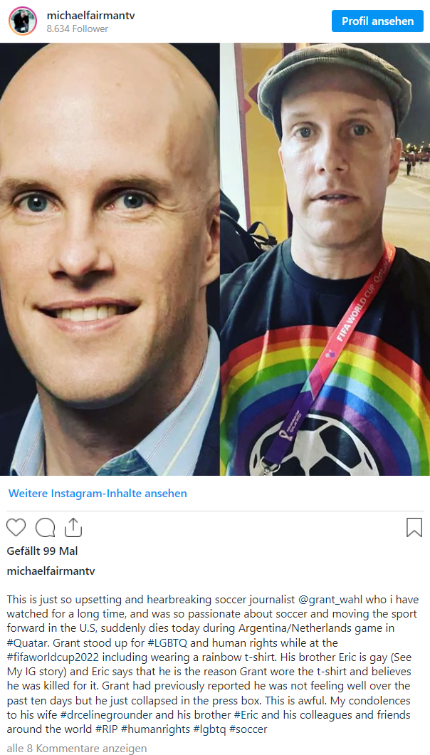Grant wollte am 21. November die Regeln des Gastgeberlandes brechen und provokant mit einem Regenbogen-T-Shirt ein Stadion betreten. Dies wurde ihm von den lokalen Behörden verwehrt, Sicherheitskräfte hielten ihn 25 Minuten lang fest. Er gab zu, mit der Aktion die Globohomo-Bewegung “LGBTQI*” unterstützen zu wollen. Sein Bruder ist offen homosexuell und klagt nun via Instagram an: Man habe Grant in Katar aufgrund seines T-Shirts ermordet. Dass es so eine hetzerische und durch nichts belegte Nachricht in die Titelzeilen schafft, ist der Macht der Globohomo-Bewegung zu verdanken, welche alle westlichen Schreibstuben durchsetzt. Hätte ein Alternativmedium so eine Nachricht verbreitet, wäre es sofort “faktengecheckt” und zensiert worden.