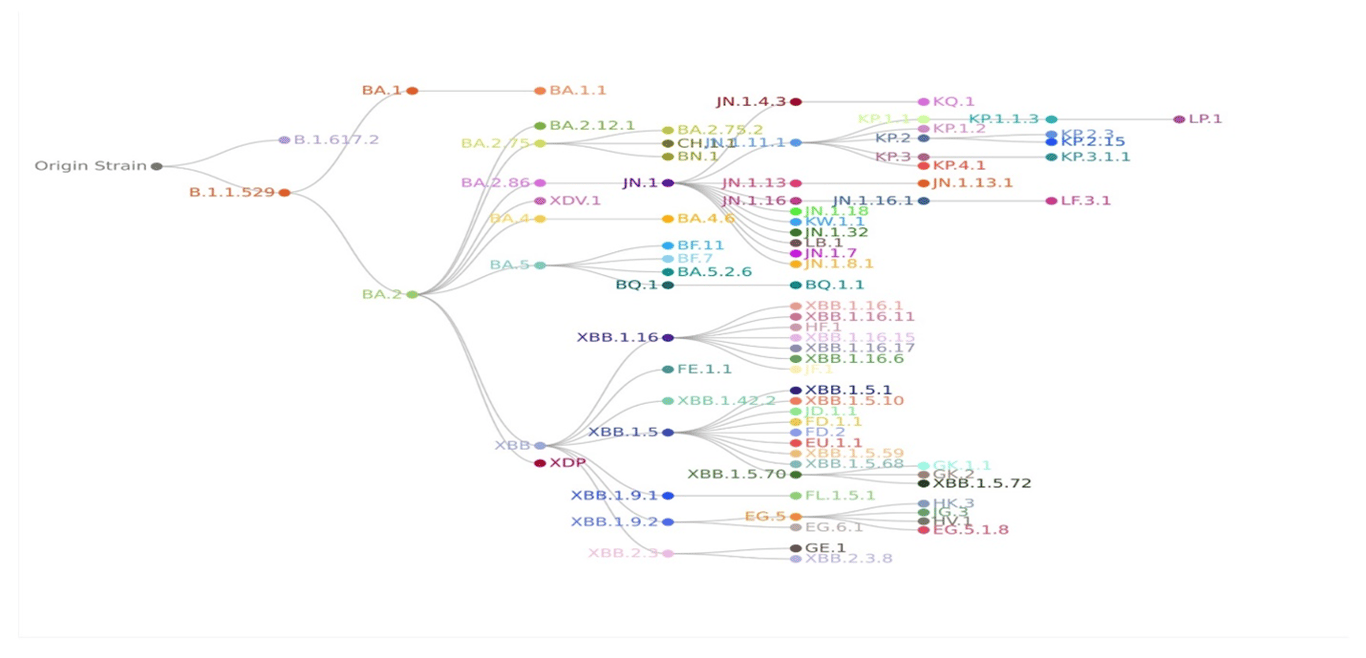 Das Diagramm unten zeigt, wie die Pango-Stämme im COVID Data Tracker zueinander in Beziehung stehen. Eine vollständige Liste der Pango-Stämme finden Sie hier.