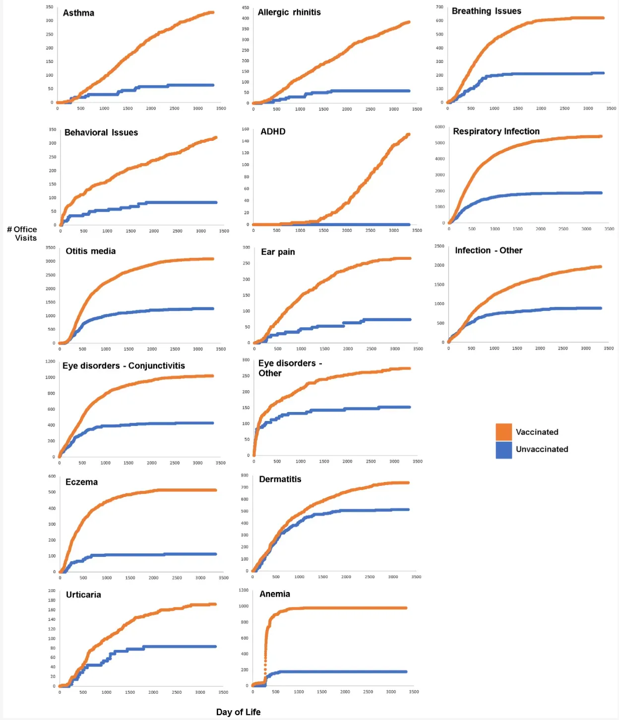 Ungeimpfte Kinder hatten deutlich weniger Arztbesuche wegen Asthma, Sprachentwicklungsverzögerungen, Verhaltensauffälligkeiten, Autismus und mehr.