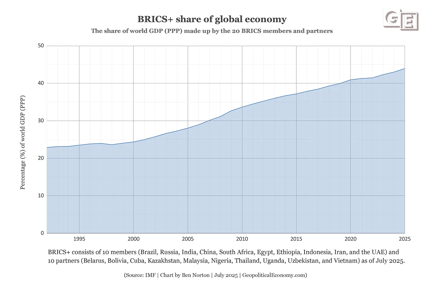 Die 20 Länder der erweiterten BRICS+ machen nun auch mehr als 40 % des weltweiten BIP aus, gemessen an der Kaufkraftparität (KKP).