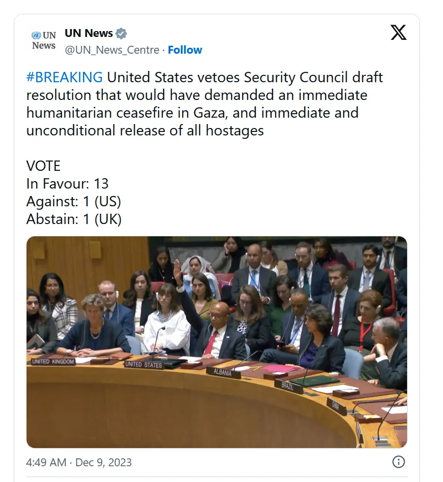 Selbst im Sicherheitsrat der Vereinten Nationen sehen wir, dass die Macht im Sicherheitsrat konzentriert ist und die USA ihr Vetorecht missbrauchen, um andere Länder daran zu hindern, Maßnahmen in der UNO zu ergreifen, die den USA nicht gefallen, selbst wenn diese Maßnahmen von der überwiegenden Mehrheit der Weltbevölkerung unterstützt werden.