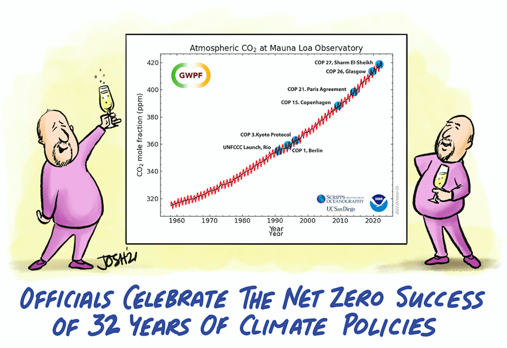Und wie recht wir hatten! Von der Ankunft der ersten Delegierten an war es genau so, wie wir es vorausgesagt hatten. Man betrachte unsere aktualisierte Historie des jährlichen COP-Rituals, aus der hervorgeht, dass Sharm el-Sheikh 2022 genau demselben Muster gefolgt ist, genau demselben Weg zum kläglichen Scheitern wie frühere COPs vor dem diesjährigen Talkfestival.