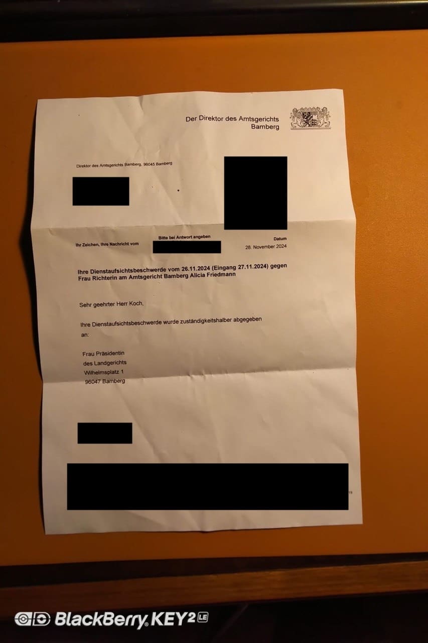 Bei der Präsidentin des Landgerichts Bamberg (Regierungsbezirk Oberfranken), Ursula Haderlein, ist in der Causa David Bendels eine Dienstaufsichtsbeschwerde gegen die Richterin am Amtsgericht Bamberg, Alicia Friedmann, „hinsichtlich aller in Frage kommenden dienstrechtlichen und ggf. strafrechtlichen Aspekte“ anhängig. Das hat der Direktor des Amtsgerichts Bamberg, Martin Dippold, bestätigt.